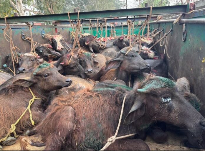 ਅਜੋਕੇ ਸਮੇਂ ਦਾ ਇਨਸਾਨ ਇਸ ਕਦਰ ਨਿਰਦਈ ਹੋ ਚੁੱਕਾ ਐ ਕਿ ਉਹ ਚੰਦ ਛਿੱਲੜਾਂ ਦੀ ਖਾਤਰ ਬੇਜ਼ੁਬਾਨਾਂ ਤੇ ਜ਼ੁਲਮ ਢਾਹੁਣ ਤੋਂ ਵੀ ਗੁਰੇਜ ਨਹੀਂ ਕਰਦਾ। ਇਸ ਦੀ ਤਾਜ਼ਾ ਉਦਾਹਰਨ ਹੁਸ਼ਿਆਰਪੁਰ ਤੋਂ ਸਾਹਮਣੇ ਆਈ ਐ, ਜਿੱਥੇ ਗਊ ਰੱਖਿਆ ਦਲ ਦੇ ਮੈਂਬਰਾਂ ਨੇ ਇਕ ਅਜਿਹੇ ਟਰੱਕ ਨੂੰ ਕਾਬੂ ਕੀਤਾ ਐ, ਜਿਸ ਵਿਚ 50 ਦੇ ਕਰੀਬ ਬੇਜ਼ੁਬਾਨ ਪਸ਼ੂਆਂ ਨੂੰ ਨਿਰਦਈ ਢੰਗ ਨਾਲ ਲੱਦ ਕੇ ਕਿਸੇ ਬਾਹਰਲੇ ਸੂਬੇ ਦੇ ਬੁੱਚੜਖਾਨੇ ਵਿਚ ਵੱਢਣ ਲਈ ਲਿਜਾਇਆ ਜਾ ਰਿਹਾ ਸੀ। ਪਸ਼ੂਆਂ ਦੇ ਕੁਰਲਾਉਣ ਦੀ ਆਵਾਜ਼ ਸੁਣ ਕੇ ਐਕਟਿਵਾ ਸਵਾਰ ਨੌਜਵਾਨਾਂ ਨੇ ਟਰੱਕ ਨੂੰ ਰੁਕਣ ਦੀ ਇਸ਼ਾਰਾ ਕੀਤਾ ਪਰ ਡਰਾਈਵਰ ਨੇ ਟਰੱਕ ਰੋਕਣ ਦੀ ਥਾਂ ਉਸ ਨੂੰ ਹੋਰ ਭਜਾ ਲਿਆ। ਇਸ ਦੌਰਾਨ ਟਰੱਕ ਡਰਾਈਵਰ ਨੇ ਨੌਜਵਾਨਾਂ ਨੂੰ ਨੁਕਸਾਨ ਪਹੁੰਚਾਉਣ ਦੀ ਕੋਸ਼ਿਸ਼ ਵੀ ਕੀਤੀ। ਨੌਜਵਾਨਾਂ ਨੇ ਇਸ ਦੀ ਸੂਚਨਾ ਤੁਰੰਤ ਗਊ ਰੱਖਿਆ ਦਲ ਦੇ ਕਾਰਕੁਨਾਂ ਨੂੰ ਦਿੱਤੀ, ਜਿਨ੍ਹਾਂ ਨੇ ਮੌਕੇ ਤੇ ਪਹੁੰਚ ਕੇ ਟਰੱਕ ਨੂੰ ਰੁਕਵਾਇਆ। ਗਊ ਰੱਖਿਆ ਦਲ ਦੇ ਆਗੂਆਂ ਨੇ ਟਰੱਕ ਨੂੰ ਥਾਣੇ ਲਿਜਾ ਕੇ ਪੁਲਿਸ ਹਵਾਲੇ ਕਰ ਦਿੱਤਾ ਐ। ਗਊ ਰੱਖਿਆ ਦਲ ਦੇ ਆਗੂਆਂ ਨੇ ਸਬੰਧਤ ਲੋਕਾਂ ਖਿਲਾਫ ਪਸ਼ੂ ਕਰੂਰਤਾ ਐਕਟ ਤਹਿਤ ਸਖਤ ਕਾਰਵਾਈ ਦੀ ਮੰਗ ਕੀਤੀ ਐ।